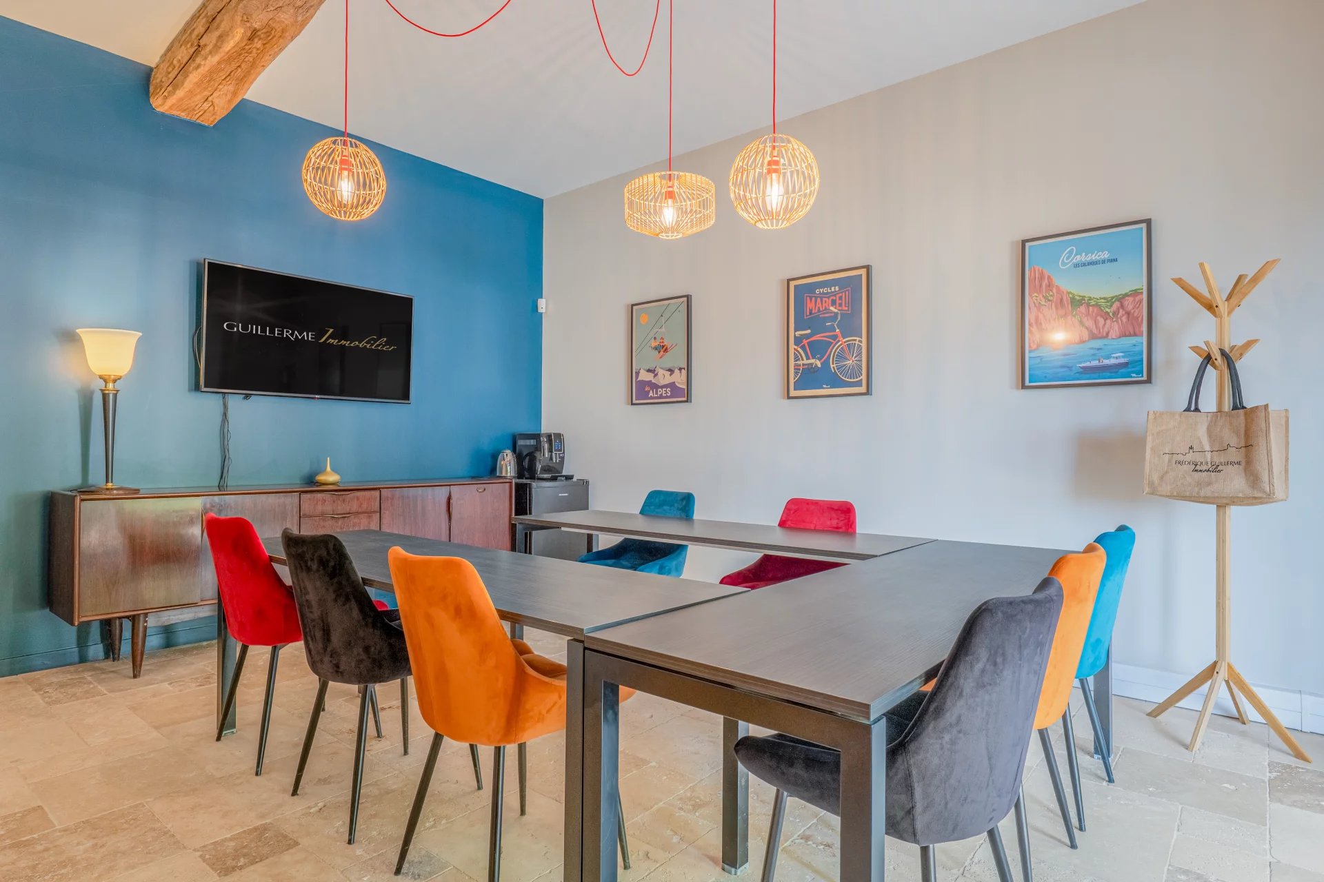 -- Guillerme Immobilier-- En plein centre du village de Dardilly le Bas, nous vous proposons à la location une salle de réunion pour vos événements. Location d'une salle de réunion pour 9 personnes à journée: - Journée : 150€ HT - Demi-journée: 100€ HT TV, café,, et paperboard inclus. Parking privatif Fibre optique Contact: Christophe Guillerme Agence Guillerme Immobilier 4 Bis Ruelle des Soeurs 69570 DARDILLUY